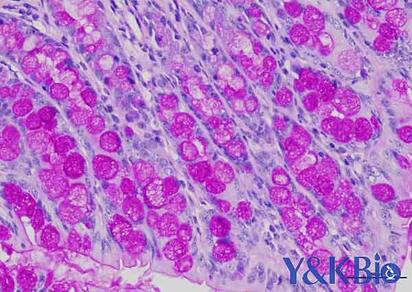 糖原、中性粘液物质、软骨基质、植物的真菌和细胞壁、上皮的基膜等均呈紫红色,细胞核浅蓝色。