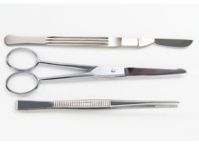 准备一支 HB 铅笔和一套取材器械。包括:组织剪、无齿镊、刀柄及一次性手术刀片,标本的取材的编号一定要用铅笔标注清晰,取材器械要锋利,尤其手术刀片。