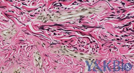 四、染色结果判读:弹性纤维呈蓝黑色;胶原纤维呈红色;背景呈淡黄色